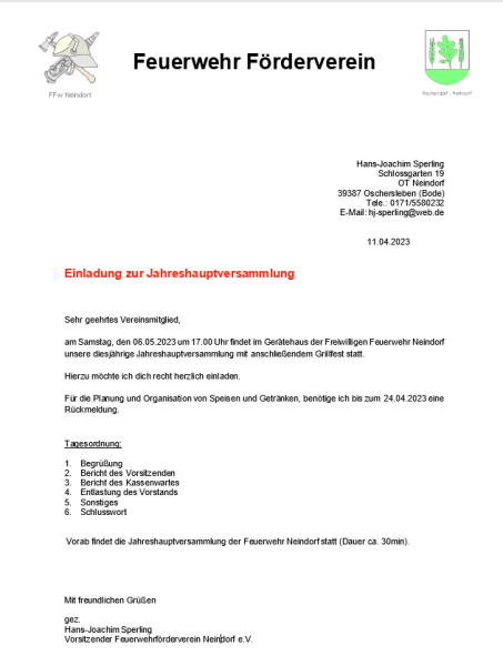 Vorab findet die Jahreshauptversammlung der Feuerwehr Neindorf statt (Dauer ca. 30min).