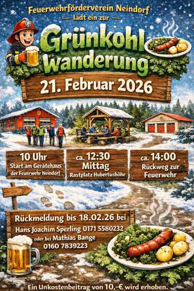 Am 21.02.2026 findet die diesjährige Grünkohlwanderung statt. Start ist um 10 Uhr am Gerätehaus der FFW Neindorf.
